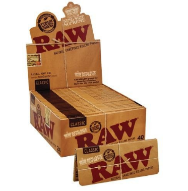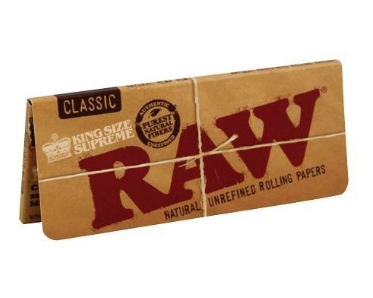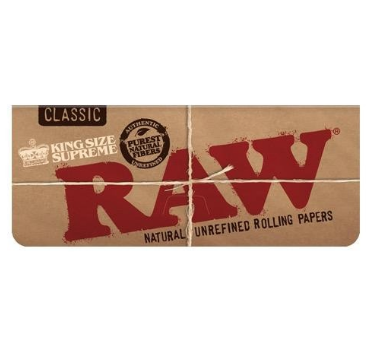Los papeles de liar Raw King Size Supreme Classic son absolutamente crudos y hechos de papel sin refinar, tienen un color cobrizo claro natural debido a la mezcla híbrida y fibras sin blanquear, lo que da resultado a un papel de fumar delgado, dorado prácticamente traslúcido. Los papeles sin doblez le dejan crear un pliegue en el papel ideal si goza de fumar cigarros en forma de cono. Cada papel es individual, con marca de agua en forma de cruz que ayuda a prevenir las «uñas» y crea un papel mas resistente durante la quema. Debido a la goma de cáñamo que se usa, no se pega tan bien como le agrada, para ello pase la llama de su mechero durante la longitud del papel para darle un tanto más viscosidad.
